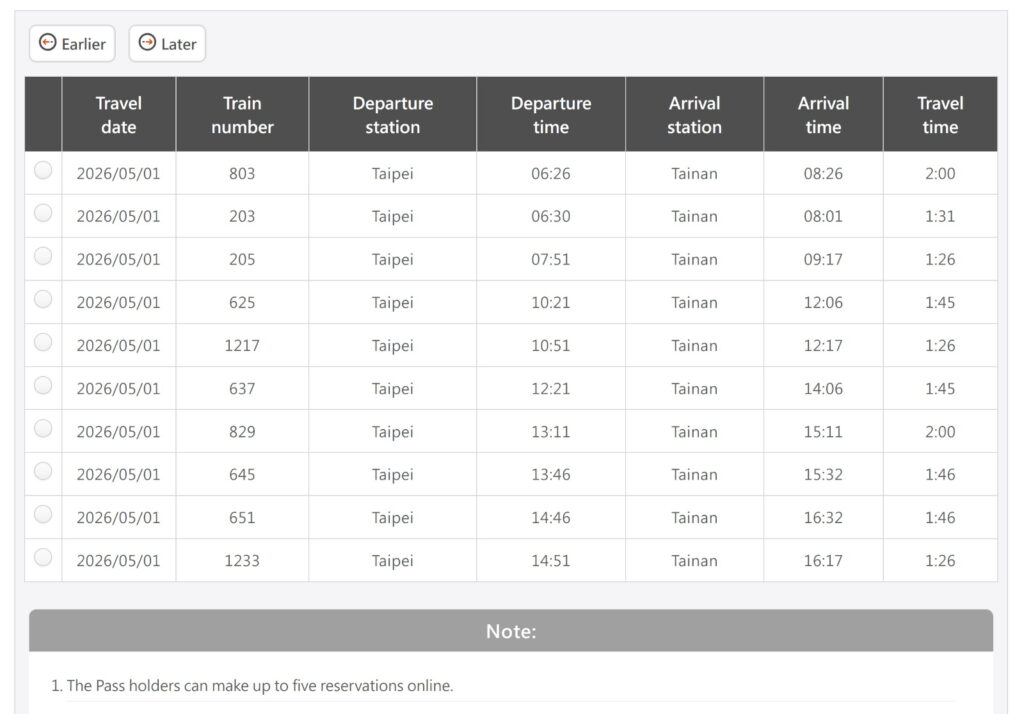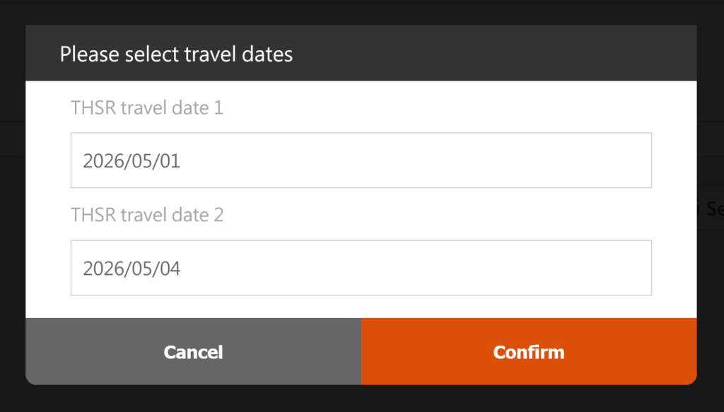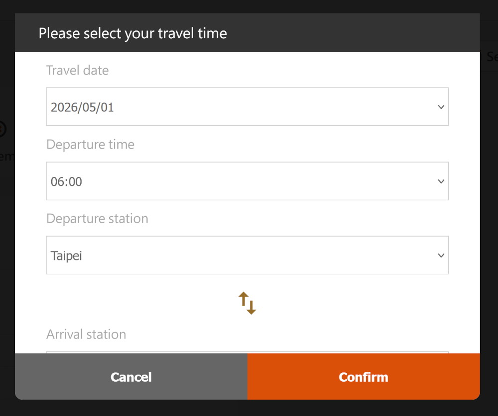 開いたポップアップで乗車日と出発駅と到着駅(上の画像では隠れています)を選択しConfirmをクリックすると乗車可能な列車が表示されます。