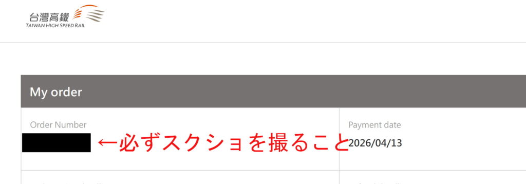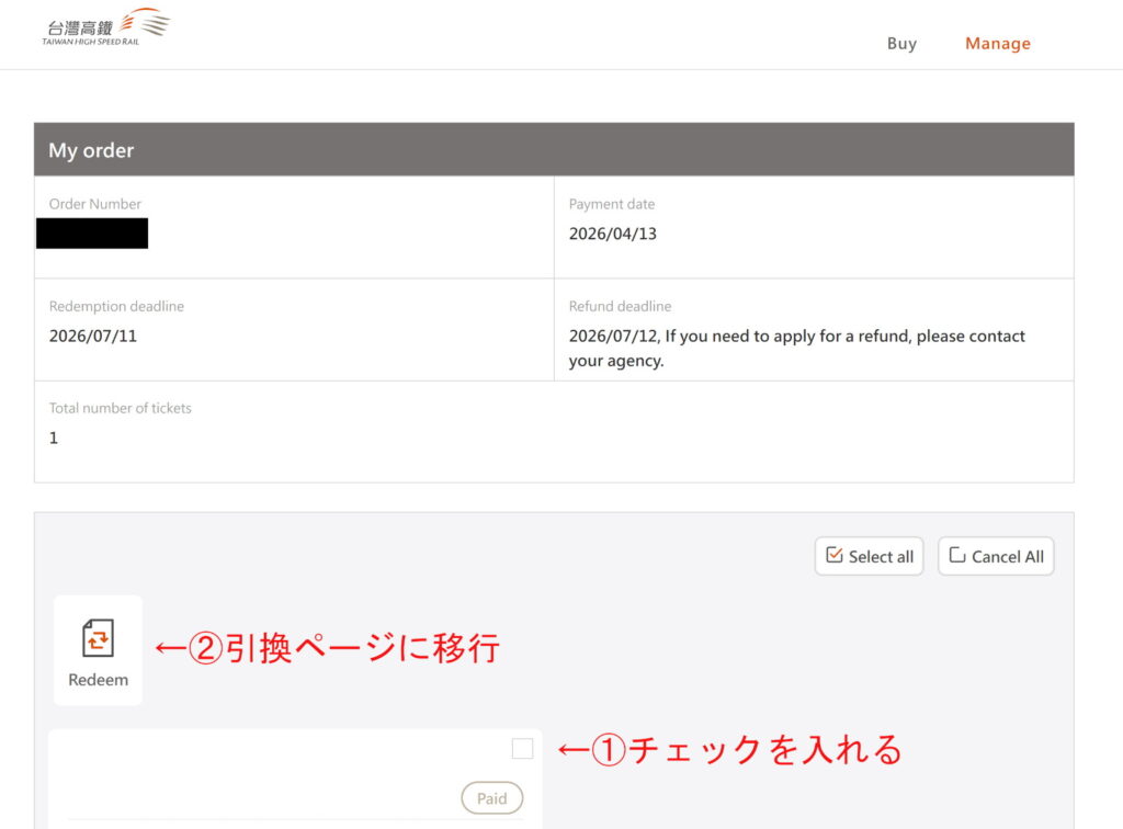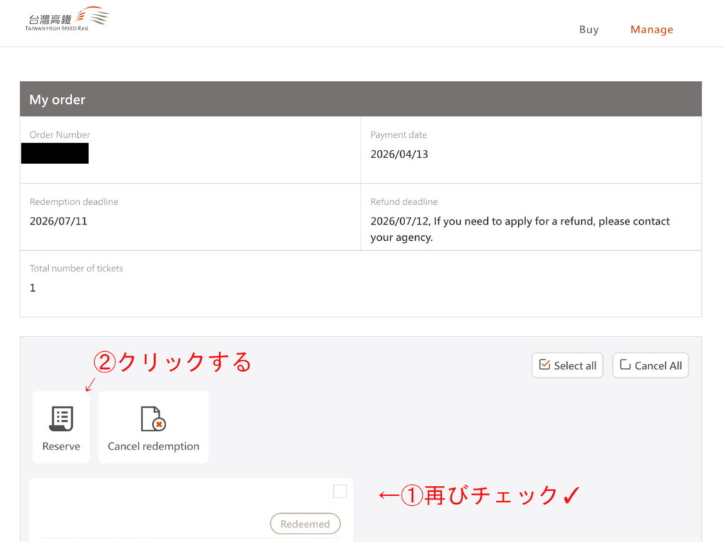 必ずMy OrderのOrder Number(黒で目隠ししたところ)をメモするかスクショを撮っておきましょう。2回目以降の座席予約で必要になります。Manageに入るには次回からこのOrder Numberが必要です。