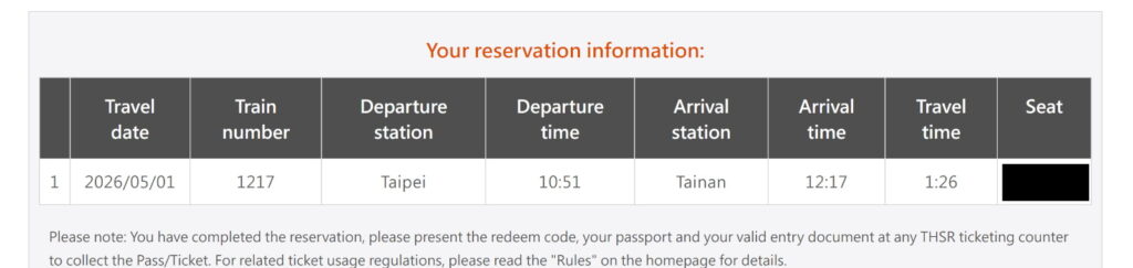 乗車する列車をチェック✓してConfirmをクリックすると(この間にもう1つ工程があったかも?)下の画像のように予約した列車が表示されます。
