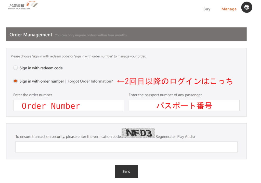 Manageのページから追加で予約もできます。ただし(引換が終わった)2回目以降のログインは「Sign in with Order Number」を使います。